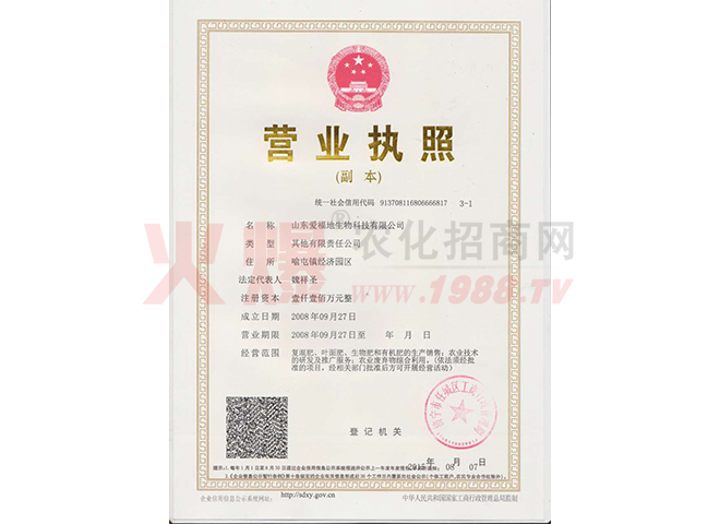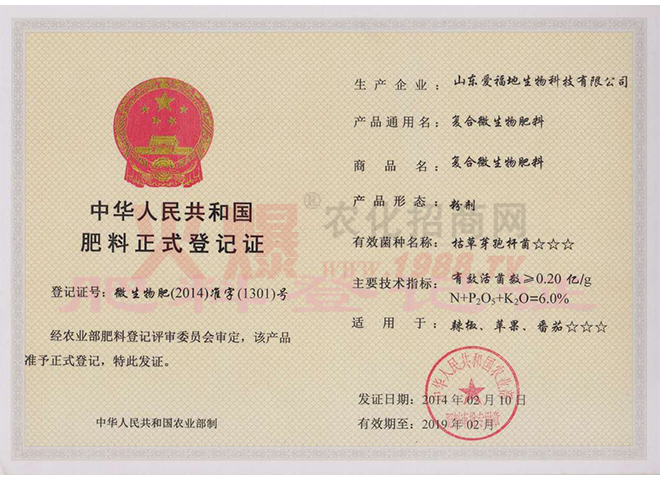 證書名稱:肥料正式登記證 發(fā)證機(jī)構(gòu):中華人民共和國農(nóng)業(yè)部