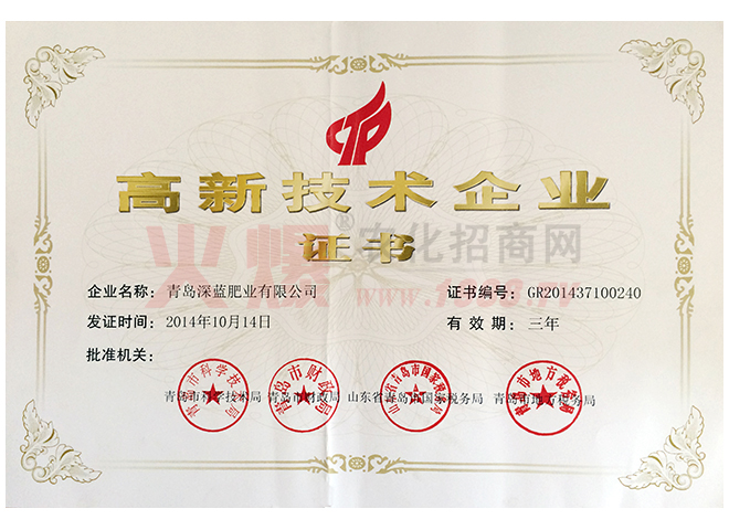 青島深藍肥業(yè)有限公司成立于2009年,是一家利用擁有自有知識產(chǎn)權(quán)的“溫和中性液體環(huán)境生物酶提取技術(shù)”從天然可食用級海帶中(不同于滸苔)提取海藻生物精華素,復配制備海藻肥的高新技術(shù)企業(yè)。